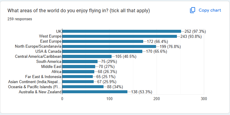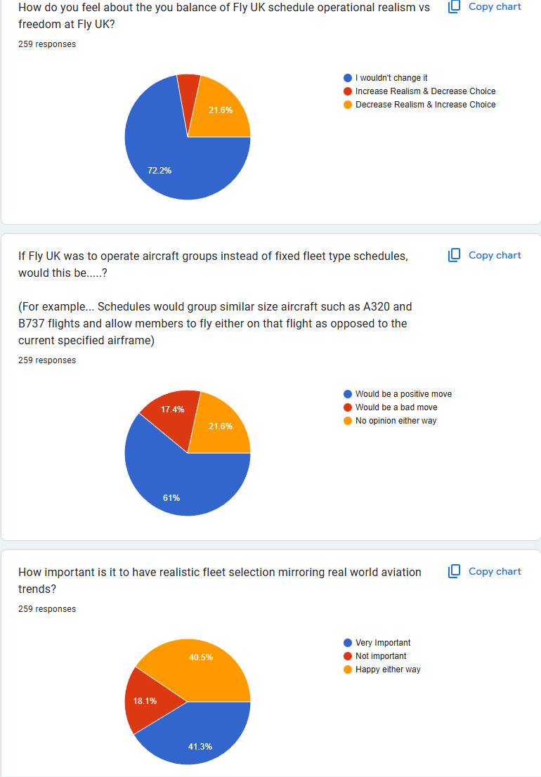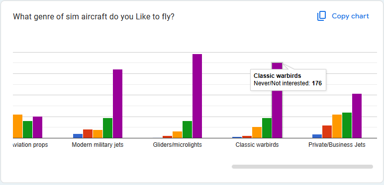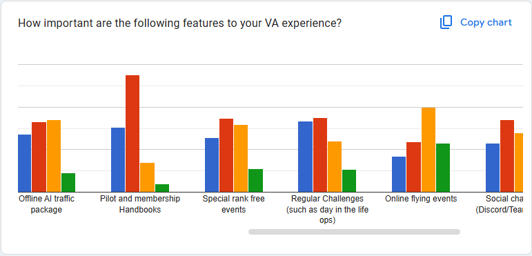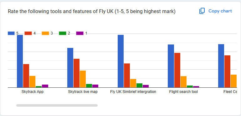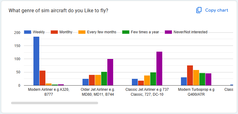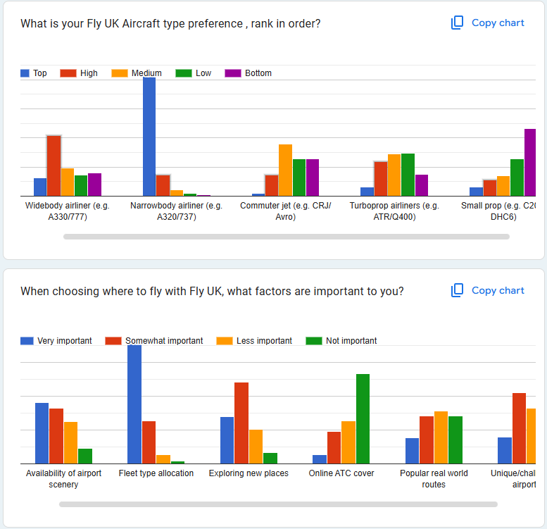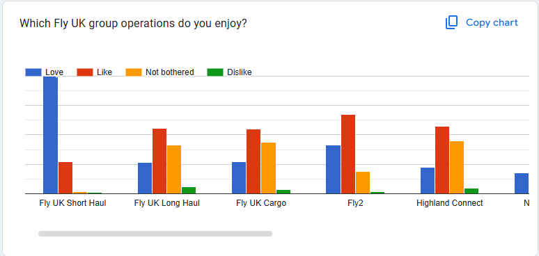 And once again, Fly UK short haul opeerations stand out in member preference. The other categories remain fairly consistent, with only Auaroa declining in preference. The Aurora fleet was very niche and not well represented in MSFS, so we'll watch the next survey with interest to compare after changes were made in 2025.