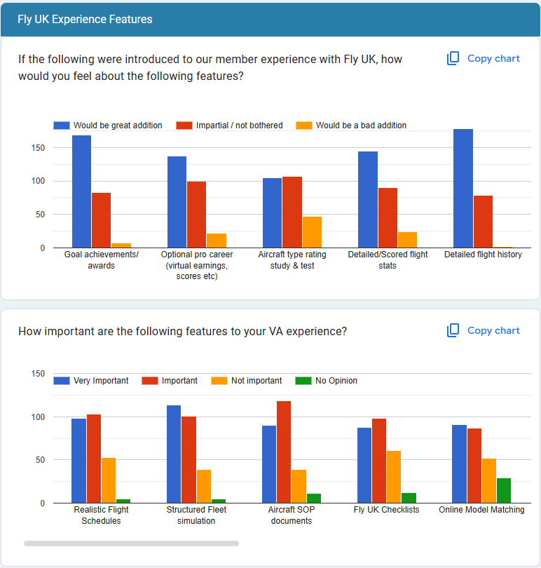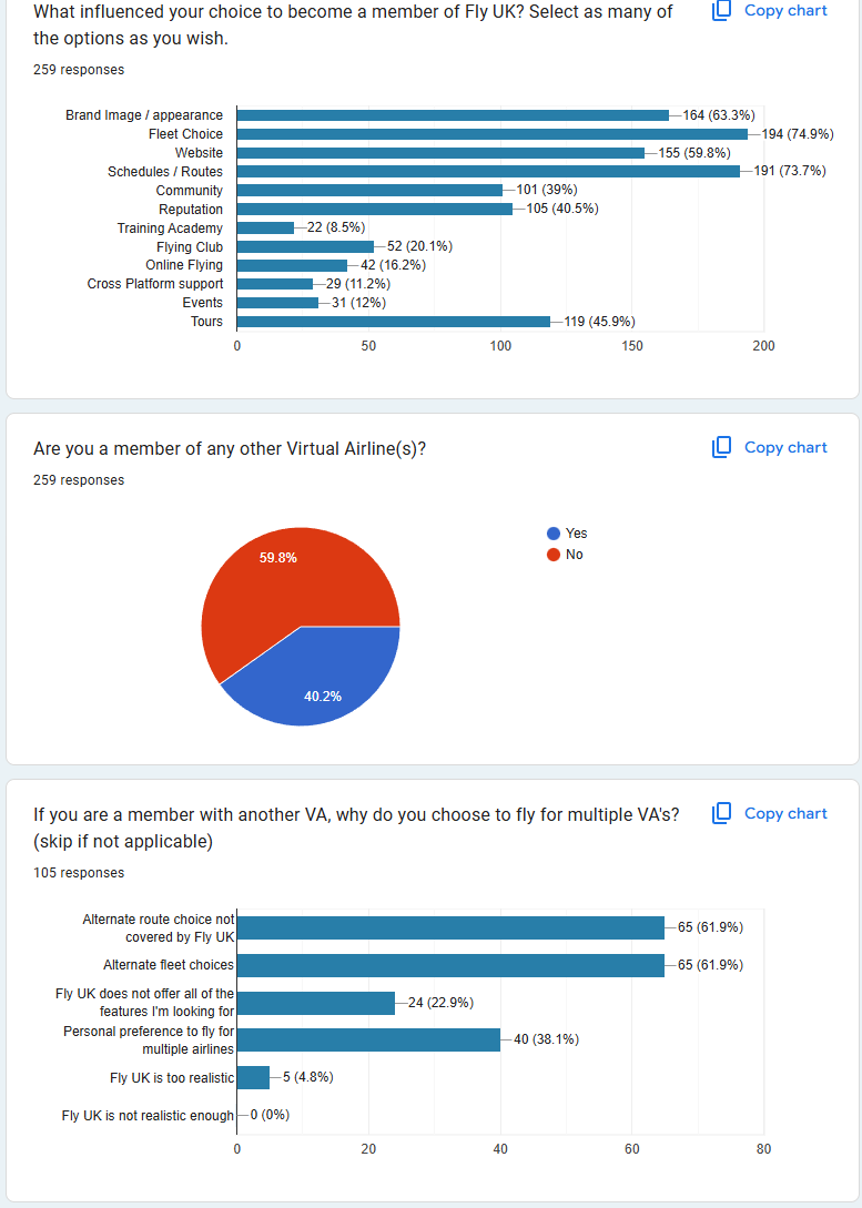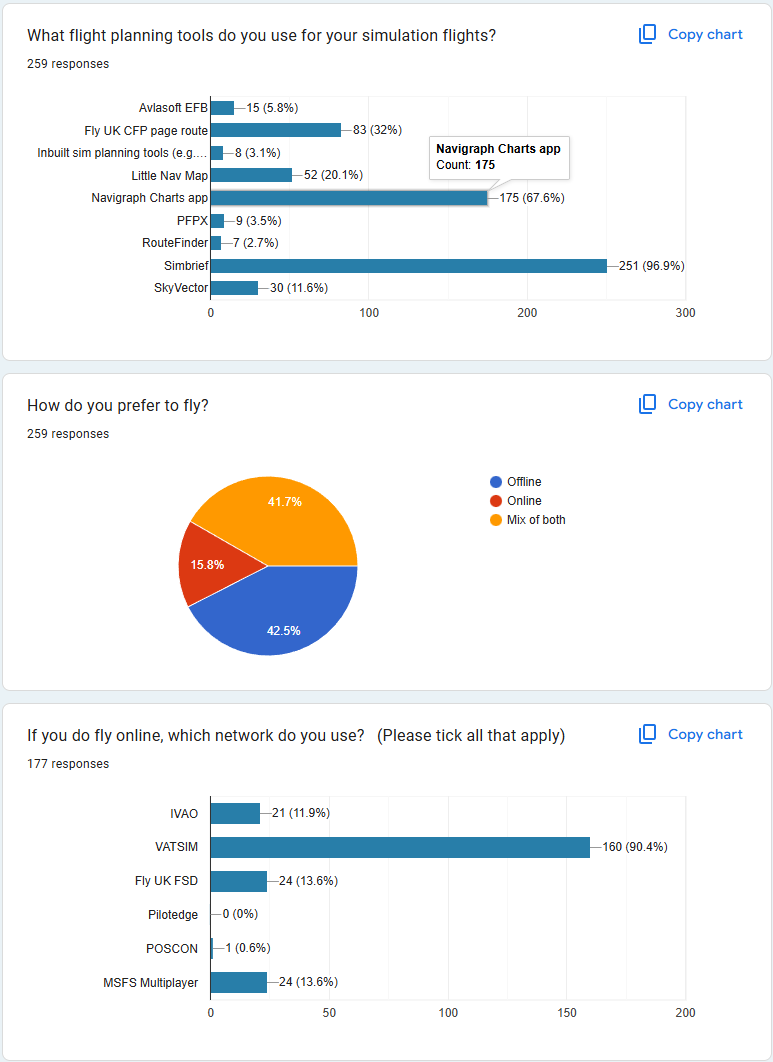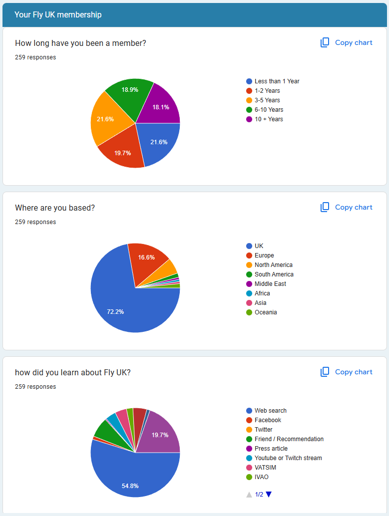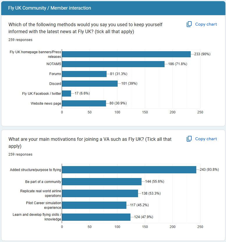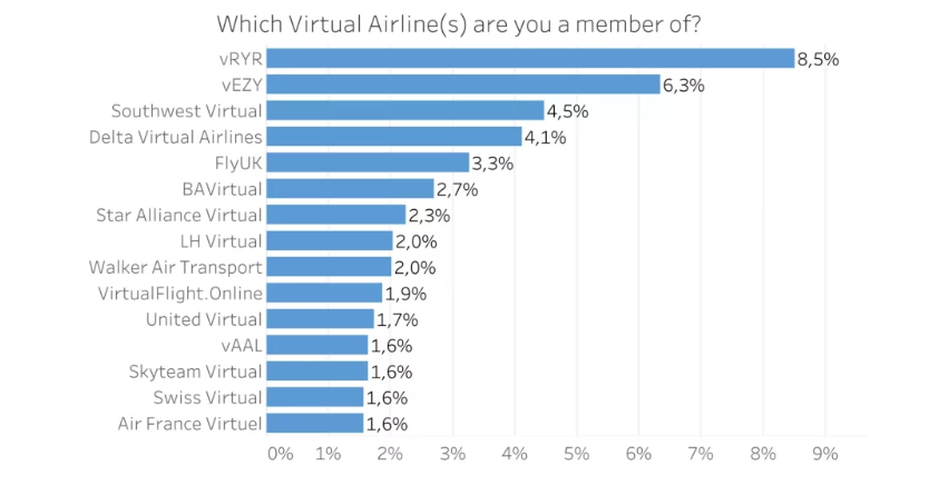 Firstly, a thank you to all our members who took part in the Navigraph surveys. It was incredible for Fly UK to feature in the top five list of VA's in the Virtual Airline category, beating some equally long-established real-world airline-based VAs and some of the larger "virtual logbook" organisations, by which we mean fly anything, anywhere. In fact, we'll start our in-depth look into our data by sharing the results from that Navigraph survey section on VA's.