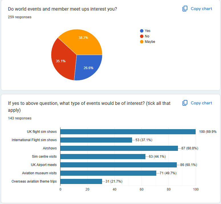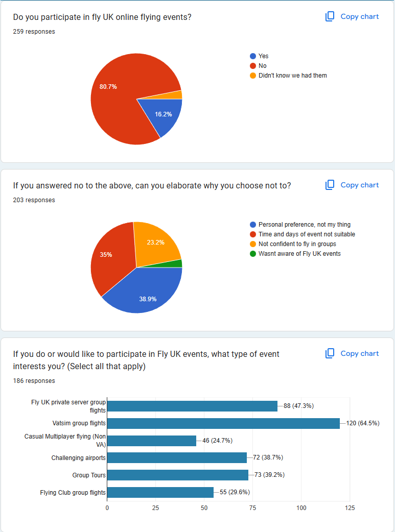Events - This data is new to the last survey and will need comparison in the next survey. What it does show is that the majority of members fly outside of events with a mixed response as to why they choose not to join. It should be noted that we have switched to Unifly since this survey, and whilst it wasn't specifically a question, the complex nature of setting up the old FSD server system was known to be a barrier.