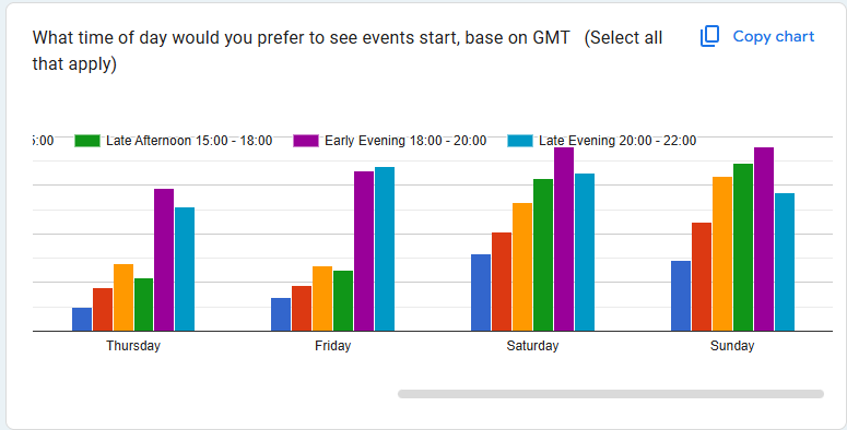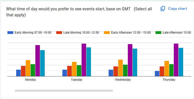 For event timings, evening and weekend stand out as preferred timings. We have added some occasional Saturday afternoon and evening events; however, actual participation hasn't necessarily reflected these results.