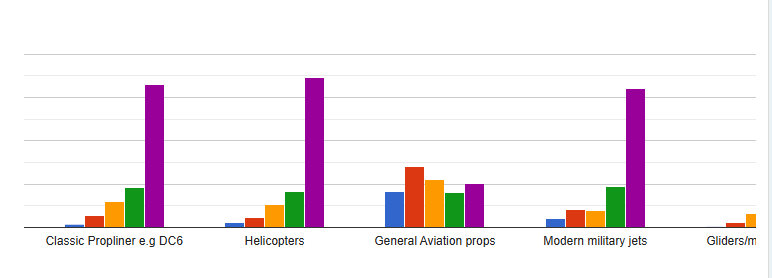 It's no surprise that modern airliners stand out in this category; this is, in essence, the heart of Fly UK operations and why folks join. Stepping back through the age catogories we see a sharp drop in older and classic jet airliners, although people do enjoy dabbling in them from time to time. Compared to the prior survey, the "not interested" result segment has risen significantly.