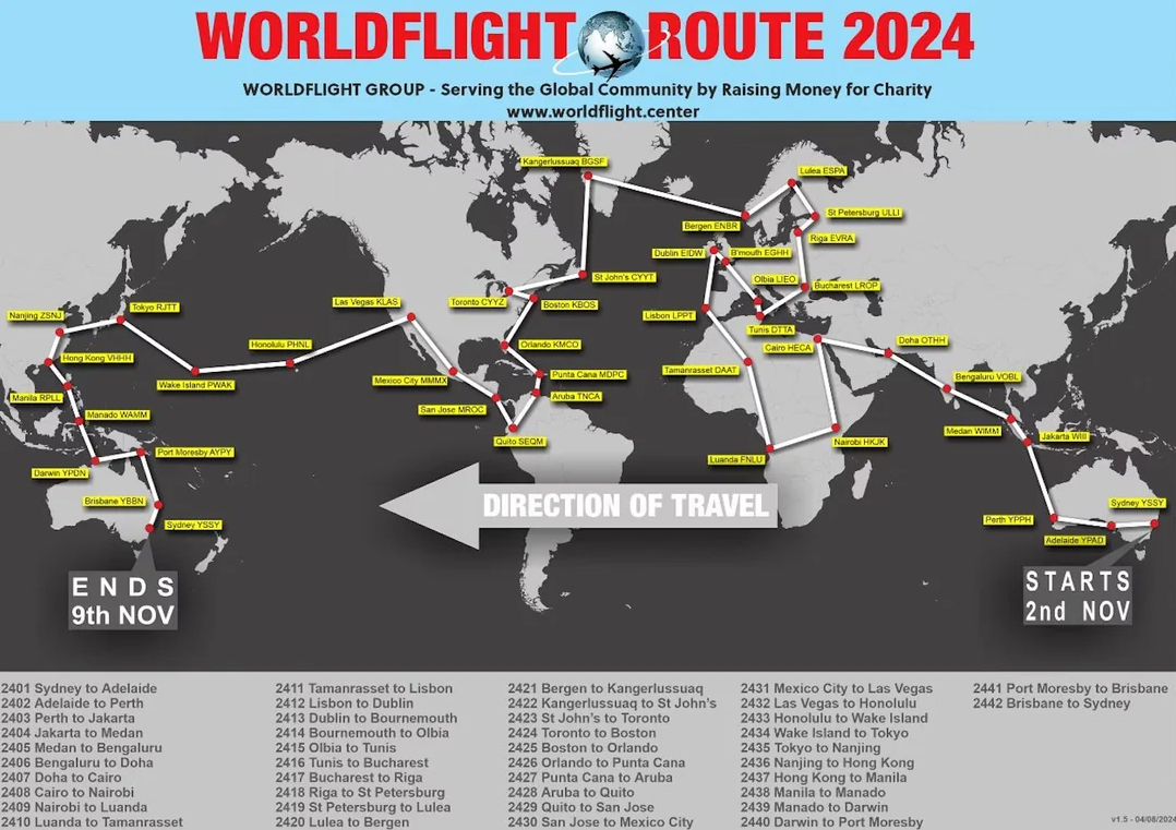 As is traditional, the event starts and ends in Sydney, Australia and heads westbound, visiting 5 continents. Various airports, both small and large, were visited. 42 legs were flown, totalling 129 hours of flight time.